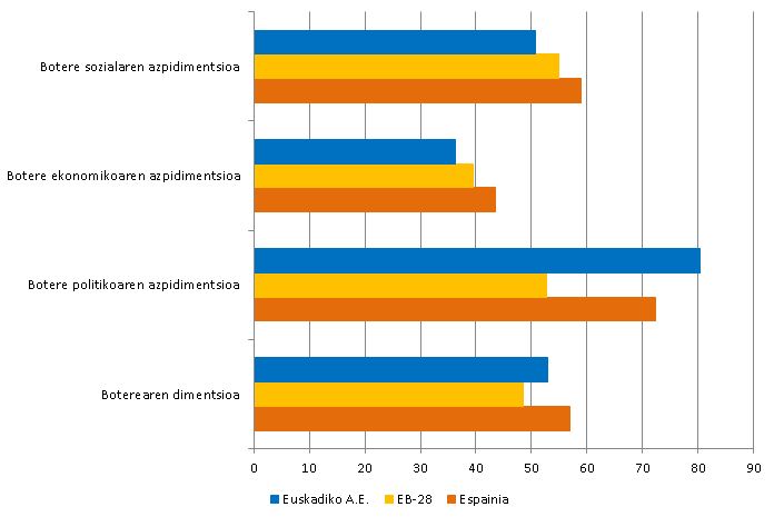 Botere politikoaren azpidimentsioan –gobernuko ordezkaritza, parlamentuko ordezkaritza eta lurralde-batzarretako ordezkaritza– Euskal Autonomia Erkidegoa (80,4) Europar Batasunaren (77,1) eta Espainiaren (72,3) gainetik dago; ez da gauza bera gertatzen aginte ekonomikoaren azpidimentsioarekin, apalagoak baitira Euskal Autonomia Erkidegoko berdintasun-puntuazioak (36,3) EBko batezbestekoa (39,5) eta Espainiakoa (43,5).