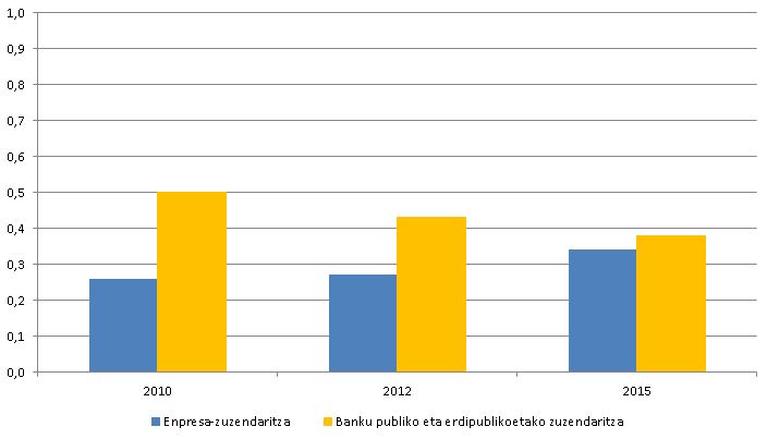 Banku publikoaren edo erdipublikoaren zuzendaritzako genero-tarteak okerrera egin du, eta, aldiz, hobetu egin da enpresen zuzendaritzan, genero-berdintasunaren indizeak jasotako kopuruen arabera.