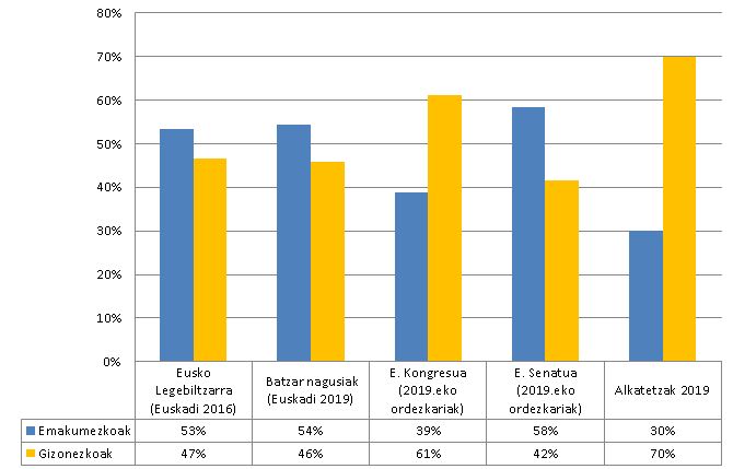 Lurralde historikoetako Batzar Nagusietan eta Eusko Legebiltzarrean, hautetsien ordezkaritza orekatua da, eta ez du gainditzen arrazoizkotzat jotzen den 40/60 ratioa. Halaber, emakumeen alderantz egiten du apur bat.
