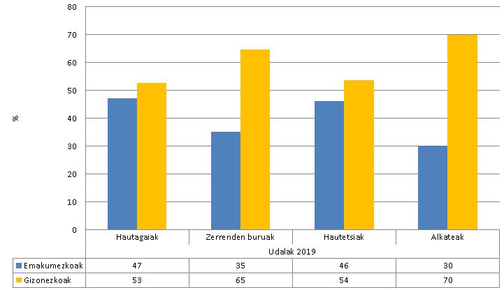 Udalei dagokienez, oraindik ere jarraitu egiten du alkatetzetako desorekak gizonen eta emakumeen artean, eta % 30 eta % 70 artean zenbatesten da 2019rako.