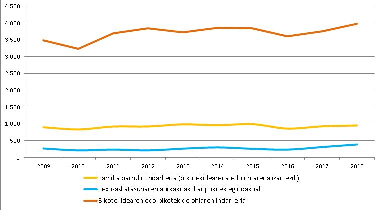 Emakumeen kontrako indarkeriaren biktimizazioaren (kasu kopuruaren) bilakaera, indarkeria motaren arabera, 2009-2018.