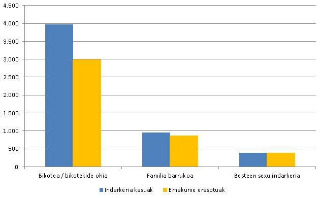 Bikote-harremana eten ostean zenbatu dira emakumeen kontrako indarkeriaren kasuen ia erdiak: 1.591 kasu bikotekide ohiaren kontra. Gainera, 800 aldiz baino gehiagoz urratu da bikotearengandik edo bikotekide ohiarengandik urruntzeko agindua.