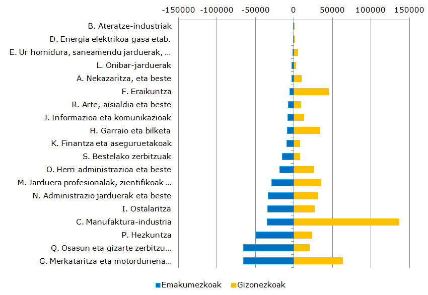«Manufaktura-industria» eta «Eraikuntza» sektoreek gizonezkoen proportzio handia dute, 2018ko Jarduera Ekonomikoen Direktorioak jasotzen duenaren arabera. Emakumeek hamar enpleguetatik bi baino gutxiago betetzen dituzte «Metalurgia eta produktu metalikoak» sektorean, eta beste horrenbeste «Makinaria eta ekipamenduak» atalean ere, Industria Estatistikak biltzen dituen datuek diotenez.