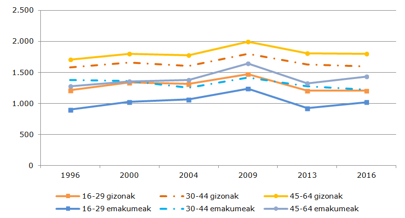 Soldatapeko eta antzeko populazioak azkeneko hilabetean kobratutako ordainsariaren batezbestekoa (euroak prezio konstantetan, 2016), sexuaren eta adinaren arabera. EAE. 1996-2016.