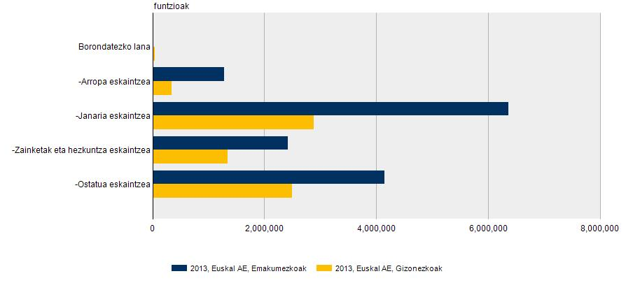 Ordaindu gabeko eta merkatutik kanpoko etxeko lanaren balioespena, sexuaren eta funtzioen arabera. Mila eurotan. 2013.