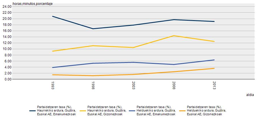 Azkeneko 20 urteetan 2013ra arte izan den bilakaerak erakusten duenez, nahiz eta gizonezkoen parte-hartzea ia 13 puntu handitu den etxeko lanetan, emakumezkoen lanak oraindik ere bikoiztu egiten du guztizkoarekin alderatuta.
