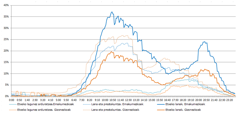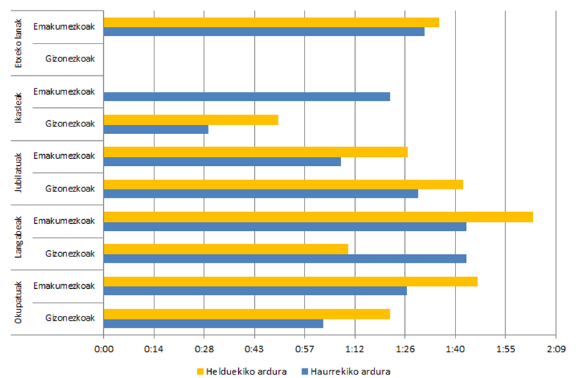 2013ko datuen arabera, egun arrunt bateko 10:00 eta 13:00 bitartean, emakumeen % 30ek baino gehiagok eta gizonen % 15ek baino gehixeagok etxeko lanetan jarduten dute.