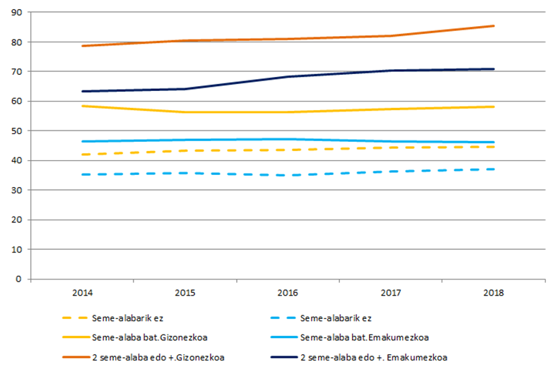 Hamasei urteko eta gehiagoko populazioaren okupazio-tasa Euskal Autonomia Erkidegoan, beren kargu dituzten seme-alaba kopuruaren eta sexuaren arabera (%). 2014-2018.