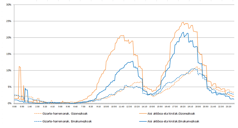 Arratsaldeko seiak eta zazpiak aldera izaten da joera handiena (gizonen eta emakumeen % 20 baino gehiago). Gizonezkoek, emakumeek baino gehiago parte hartzeaz gain (tasa handiagoak dira), ordu-tarte luzeagoz ere jarduten dute. Hala, 21:00etatik aurrera, emakumezkoen aisialdi aktiboa % 4,5era murrizten da, eta gizonezkoen kasuan, berriz, ordu eta erdi geroago iristen da ehuneko horretara.