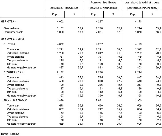 Heriotza-kausa nagusia tumoreak izan ziren: 1.291 pertsona hil ziren kausa horrengatik (%31,9); haren atzetik, bigarren heriotza-kausa gisa, zirkulazio-sistemako gaixotasunak ageri dira, 1.200 heriotza eragin baitzituzten (%29,6). Hirugarren tokia arnas aparatuko gaixotasunek hartu zuten, 351 heriotza eragin baitzituzten (%8,7).