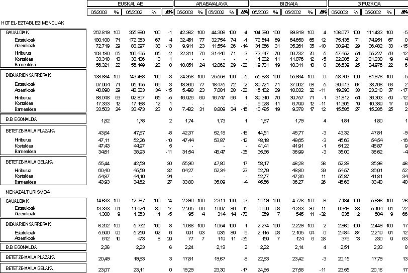Euskal AEko ostalaritza-establezimenduetan, 138.884 bidaiari-sarrera erregistratu dira 2003ko maiatzean, Eustatek landutako datuen arabera. Zifra horiek erakusten dute % 3ko gutxitzea gertatu dela aurreko urteko hil beraren aldean, hots, 2002ko maiatzean baino ia 5.000 bisitari gutxiago izan direla. Hiru herrialdeetan ez dute bilakaera bera izan bidaiarien sarrerek. Urte arteko gutxitzerik handiena Gipuzkoan eta Araban jazo da (% 5 lurralde bietan); Bizkaian, ostera, ez da batere aldakuntzarik izan (% 0).