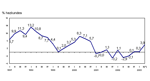 2003ko apirilean, urte arteko aldakuntzarik positiboenak, balio homogeneotan, sektore hauei egokitu zaizkie: metalezko eta ez-metalezko meak, ehungintza eta jantzigintza eta petrolioa fintzea arloei %20tik gorako tasekin, eta material elektrikoa (%12,9), kautxua eta plastikoa (%11,5), eta ez-metalezko industria (%10,5) arloei, besteak beste.