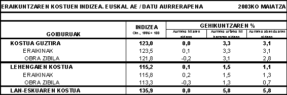 Sektoreak kontsumitutako lehengaien artetik, 2003ko maiatzean, hauek izan dituzte inflazio-tasarik handienak: kristala (%4,5), karea, igeltsua eta eskaiola (%2,0), energia elektrikoa (%1,7) eta burdina eta altzairua (%0,9) lehengaiek. Bestalde, hileko batez besteko prezioen jaitsiera izan dute honakoek: petroliotik eratorritakoak (%-4,7), plastikozko hoditeria (%-0,4) eta leherkariak eta gasak (%-0,2) lehengaiek, besteak beste.