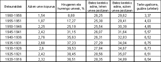 Eta hurrengo belaunaldiko emakumeek, 1956 eta 1960 bitartean jaioek, jadanik euren bizitza ugalkorra ia bukatuta dutelarik, apenas gainditzen duten 1,5 seme-alabako seme-alaba kopurua. Belaunaldiak ez ordezkatzea esplikatzen duten arrazoia hirugarren eta hurrengo seme-alaben kopurua bat-batean gutxitu izana da: 1941 eta 1945 bitarteko belaunaldiko emakumeen seme-alaba guztien % 36 ziren, eta % 9 dira 1956 eta 1960 bitartean jaioen seme-alaben artean. Seme-alaben guztizko kopuruaren urritze horrek, ondorio gisa, ugaltzealdia urte gutxi batzuetan kontzentratzea ekarri du. 1936 eta 1940 bitarteko belaunaldiak 6,5 urteko tartean izaten zituen seme-alabak; 20 urte geroago jaiotako emakumeek, ostera, 3,4 urtean izan dituzte.