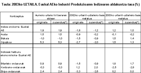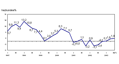 2003ko uztailean, urte arteko aldakuntzarik positiboenak, balio absolutotan, sektore hauei egokitu zaizkie: petrolioa fintzea (%28,8), ehungintza eta jantzigintza (%9,0), material elektrikoa (%5,4), kautxua eta plastikoa (%5,3), eta elikagai-industria (%4,8) arloei, besteak beste.