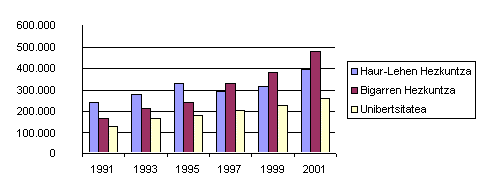 Ia gastu hori osoa, % 91,8, jarduera arruntetarako da; eta gainerako % 8,2ak, inbertsioetarako. Gastu arrunta, 1.081 milioi euro, irakaskuntzara bideratu zen % 95 (irakaskuntzako atal nagusia —% 89,3— langileria-gastuak izanik); jarduera osagarrietara, % 0,4; eta zerbitzu osagarrietara (jantokia eta eskola-garraioa, batik bat), % 4,8.