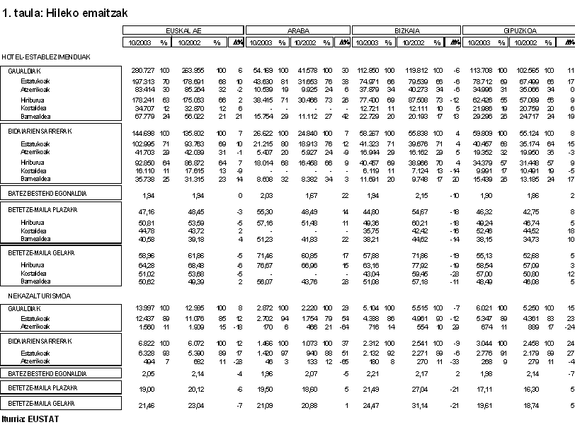 Euskal AEko hostalaritza-establezimenduetan, 144.698 bidaiari-sarrera erregistratu dira 2003ko urrian, Eustatek landutako datuen arabera. Zifra horiek erakusten dute %7ko gehitzea gertatu dela aurreko urteko hil beraren aldean, hau da, 11.000 sarrera gehiago izan direla. Hiru herrialdeetan izan dute bidaiarien sarrerek bilakaera positiboa: Gipuzkoan %8, Araban %7 eta Bizkaian %4 igo dira.