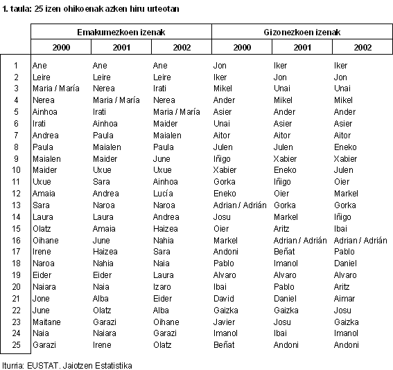 Izen euskaldunak nagusitu dira eta batzuk, idazkera desberdinekin erregistratzen dira, esate baterako, Ane-Anne, Itxaso-Itsaso, Leire-Leyre, Jon-Ion, Aritza-Haritz. Izena bi eratara idazteko kasu horiek guztiak, Haritz salbu, 100 ohikoenen barruan daude.