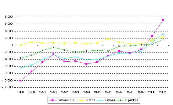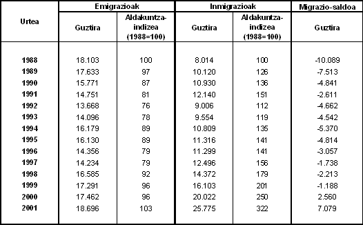 Atzerriko nazionalitatea duten immigranteak, 2001. urtean, 11.353 lagun izan direla zenbatu da, hots, aurreko urtean baino % 55 gehiago, eta gure erkidegoko sarrera guztien % 44 izan dira. 1988az geroztik, nabarmen gehitu dira atzerriko nazionalitatea duten immigranteen sarrerak, Euskal AEn. Kopuru absolututan, 500 sarrera ingurutik 10.000 pasara igo da 2001ean, hau da, atzerritarren immigrazioak hogeirekin biderkatu dira hamabi urtean. Kontuan izan behar da atzerriko immigranteetatik zenbait beste autonomia-erkidego batzuetatik etorri direla. Zehazki, 2001ean 3.152 kasutan gertatu zen hori.