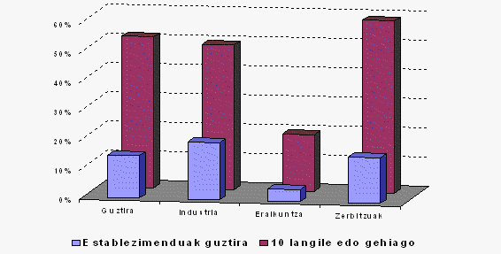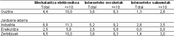 Informazioa gehiago xehatuta eta tamaina kontuan hartuta, 10 langile edo gehiagoko establezimenduen %10,0 dira bide elektronikoetatik merkataritza-transakzioak egiten dituztenak, iazko %6,4ren aldean. Era berean, 2002an, %8,3k egiten dituzte erosketak sarearen bidez eta %2,8k salmentak, 2001eko %5,1 eta %1,8ren aldean, hurrenez hurren.