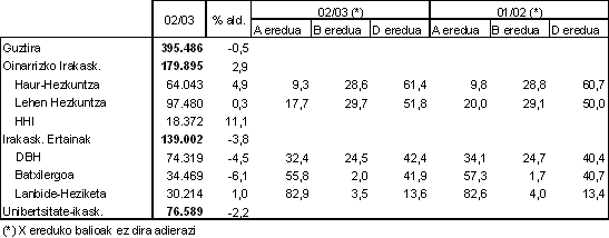 Haur Hezkuntzan, D ereduan ikasleen % 61,4k egin zituzten ikasketak; B ereduan, % 28,6k; eta A ereduan, % 9,3k baino ez. Lehen Hezkuntzan ere, D eredua hartu zuten gehienek, ikasleen % 51,8k; B eredua izan zen bigarren, % 29,7rekin; eta A eredua hirugarren, % 17,7rekin. Bai DBHn, bai Batxilergoan, euskaraz ikasi zuten ikasleak % 40 baino gehixeago izan ziren; Lanbide Heziketan, berriz, kopuru apalagoa, % 13,6. Edonola ere, oro har, maila guztietako joera da D ereduan aurreko urtean baino ikasle gehiago matrikulatzea.