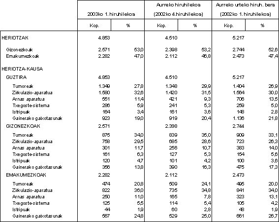 Normalean, lehenengo hiruhilekoan izaten da heriotza gehien eta arnas aparatuko gaitzak izaten dira heriotza-kopuruan gehikuntza handiena izaten dutenak. Aurten, arnas aparatuko gaitzek eragindako heriotzen gehikuntza %30,8ko izan zen, aurreko hiruhilekoaren aldean,. Hala ere, aipatzekoa da aurtengo eragin txikia iazko hiruhileko berean izan zuenaren aldean, %22 heriotza gutxiago izan baitziren kausa honengatik. Beraz, arnas aparatuko gaitzak heriotza guztien %11,4 hartu zuten, 2002ko lehenengo hiruhilekoan baino bi puntu gutxiago.