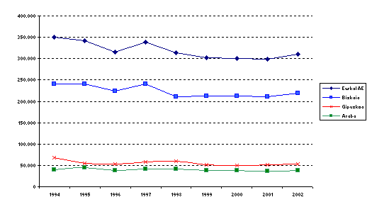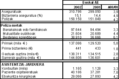 Poliza-modalitateari begiratuta, banakakoa edo familiako polizek hartzen dituzte barruan aseguratu gehienak, % 54,9. Hurrengoak, enpresetarako edo bestelako kolektibo konkretuetarako polizak dira (% 25,8), eta mutualitate publikoenak (% 19,3). Dena dela, poliza kolektiboak gora jarraitzen du, aurreko hiru urtean (1999-2001) bezalaxe. Poliza kolektiboak izan du hazkunderik handiena (% 6,1), 2001. urtearen aldean; banakakoa edo familiako polizak eta mutualitate publikoak, berriz, % 3,3 eta % 4,4 hazi ziren, hurrenez hurren.