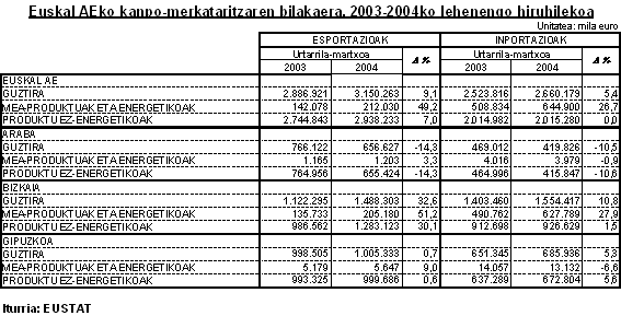 Kanpo-merkataritzaren hiruhileroko bilakaerak elkarrengandik urruntzen diren joerak izan zituen Euskal AEko hiru lurraldeetan. Bizkaiko esportazioak %32,6 hazi ziren, garraio-materiala (%186,5), material elektrikoa (%13,5) eta mea-produktuak (%51,2) arloek izandako bultzadaren ondorioz. Gipuzkoako atzerriko salmentek %0,7ko igoera txikia izan zuten, besteak beste, garraio-materiala (%6,3) eta metalak eta euren manufakturak (%6,0) arloen hazkunde neurritsuek eta material elektrikoa (%-0,3), plastikoa eta kautxua (%-17,6) eta jateko produktuak (%-25,4) arloen jaitsierek eraginda. 2004ko lehenengo hiruhilekoan Arabako esportazioek %14,3 egin zuten atzera, garraio-materiala (%-38,7) eta material elektrikoa (%-6,7) arloen esportazioek izandako atzerakadaren eraginez, metalak eta euren manufakturak (%11,9) igo egin ziren arren.