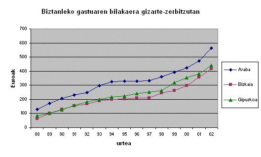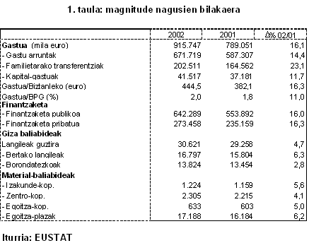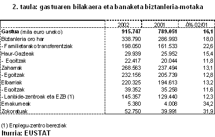 Herrialdeka, 2002an, gastua %19 handitu zen Araban, %16 Bizkaian, eta %15 Gipuzkoan. Biztanle-kopuruaren arabera, Arabak gainerakoek baino gastu-maila handiagoa du; izan ere, biztanleko 562 euro gastatzen ditu batez beste; Gipuzkoak, 440 euro, eta Bizkaiak, 416 euro.