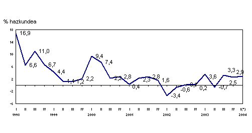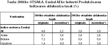 2004ko otsailean, urte arteko aldakuntzarik positiboenak, balio absolututan, sektore hauei egokitu zitzaizkien: petrolioa fintzea (%100,3), energia elektrikoa, gasa eta ura (%17,7), kautxua eta plastikoa (%7,5), metalezko eta ez-metalezko meak (%4,8) eta garraio-materiala (%4,7) arloei, besteak beste. Urte arteko hazkunde-tasa negatiboak, berriz, honako hauek izan zituzten: larruaren eta oinetakoen industria (%-15,8), janari-industria (%-8,9), bestelako manufakturak (%-8,5) eta material elektrikoa (%-1,8) arloek, batik bat.