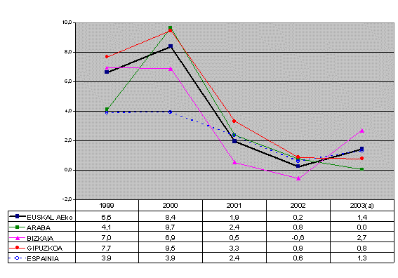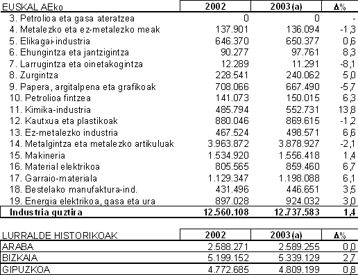 Euskal AEko industriajarduerako balio erantsiak % 1,4ko hazkunde erreala izan du 2003an, eta aurreko urtean (% +0,2) baino gehiago hazi da, Eustatek landutako datuen arabera. Jokaera hori ez da berdina izan hiru lurraldeetan. Bizkaia eta Gipuzkoa, kopuru errealetan, % 2,7 eta % 0,8 hazi dira, hurrenez hurren; eta Araba aurreko urteko maila berean mantendu da.