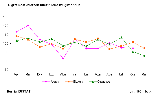 EUSTATek egindako Jaiotzen Estatistikako 2004ko lehen hiruhilekoko datuetan, 4.554 jaio jaso ziren, hots, iazko aldi berean izandakoen antzeko kopurua. Lurraldeka, Araban 636 ume jaio ziren, %7ko hazkundearekin; Bizkaian 2.350 jaiotzarekin, hazkundearen ehunekoa %1ean kokatu zen. Gipuzkoan, berriz, %3 jaitsi zen, 1.568 jaiotzarekin.