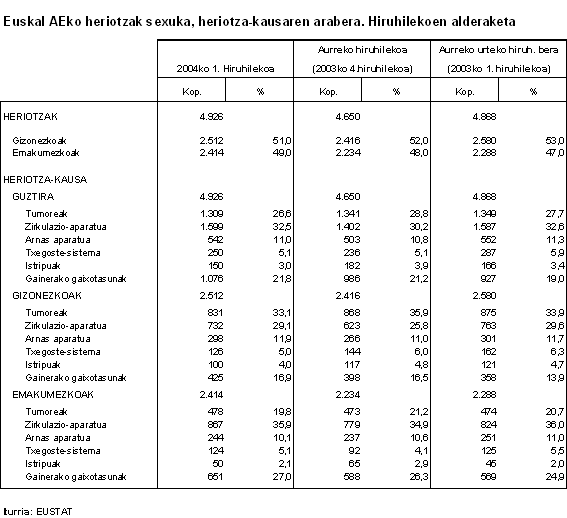 2004ko lehenengo hiruhilekoan, Euskal AEn 4.926 lagun hil ziren, iazko aldi berean baino %1,2 gehiago, EUSTATen datuen arabera. Lurralde historikoka, Araban 588 lagun hil ziren (%6,3), Bizkaian 2.748 (%1,6) eta Gipuzkoan 1.590 (%-1,2).