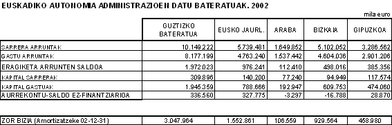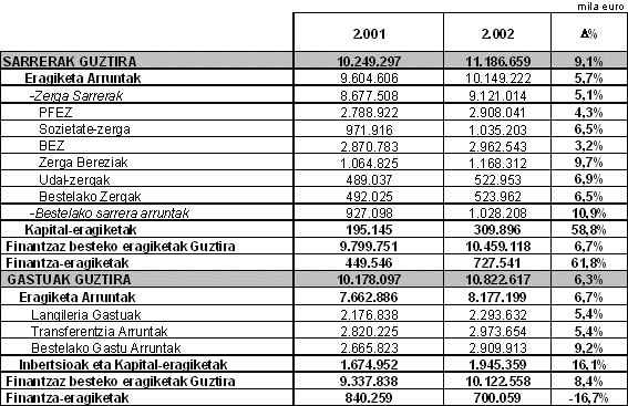 Sarrera arruntetan, zerga-sarreren barruan, errubrika honen %32,5 hartu zuen BEZak %3,2 bilakaera positiboa izan zuen. PFEZa %4,3 hazi zen 2002an eta zerga-sarreren %31,9 hartu zuen. Ehuneko hazkunderik handienak Zerga Bereziek (%9,7) izan zuten, ondoren, Udal Zergek (%6,9) eta azkenik, Sozietate Zergek (%6,5).