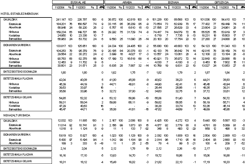 Euskal AEko ostalaritza-establezimenduetan, 133.817 bidaiari-sarrera erregistratu ziren 2004ko azaroan, Eustatek landutako datuen arabera. Zifra horiek erakusten dute %6 gehiago izan zirela aurreko urteko hil beraren aldean, hau da, 8.000 sarrera gehiago izan zirela. Hiru lurraldeetako bitan izan zuten bilakaera positiboa bidaiarien sarrerek: Bizkaian %12 eta Gipuzkoan %5 gehitu ziren, baina Araban %2 gutxitu ziren.