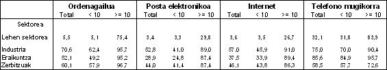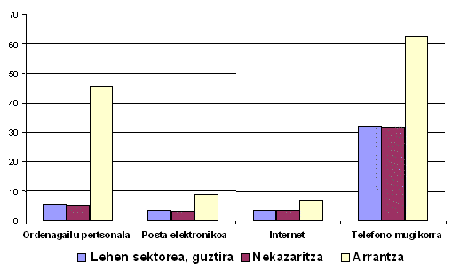 Nekazaritza-sektorean, teknologia horien erabilerak oso ehuneko txikiak ditu; hala, telefono mugikorrean ehuneko handiena du (% 31,8), eta posta elektronikoan txikiena (% 3,3), eta tartean ordenagailuak (% 5,1) eta Internet (% 3,6) daude. Arrantza-sektorean, aitzitik, ehunekoak handiagoak dira; hartara, telefono mugikorrak % 62,5 erabiltzen dira, % 8,8 posta elektronikoa, % 45,8 ordenagailuak, eta % 6,8 Internet.