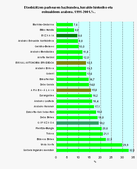 1991 eta 2001 urteen artean Euskal Autonomia Erkidegoan 104.240 etxebizitza gehiago egon dira; izan ere, eta EUSTATen datuen arabera, 1991 eta 1996 bitartean urtean 9,272 etxebizitza gehiago egon da eta 1996 eta 2001 bitartean hazkunde hori areagotu egin da, urtean 11.576 etxebizitza gehiago egon direlako.