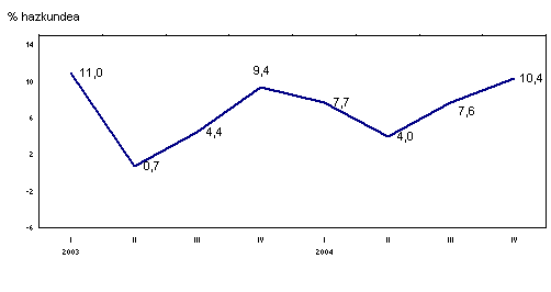 EUSTATek landutako datuen arabera, 2004ko laugarren hiruhilekoan, lan egutegi homogeneoan %10,4 hazi zen, termino nominaletan, Euskal AEko eraikuntzako jarduera, 2003ko hiruhileko beraren aldean. 2004 guztirako hazkunde-tasa metatuak %7,5eko hazkundea lortu zuen, aurreko urtearen aldean.