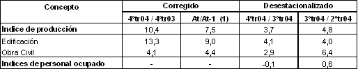 Eraikuntza-sektorearen bilakaera positiboa, 2004ko azken hiruhilekoan, gehiago oinarritu zen eraikinak azpisektorean, obra zibila azpisektorean baino. Izan ere, lehenak %13,3ko igoera izan zuen; bigarrenak, berriz, %4,1ekoa, lan-egutegiaren eraginak zuzendu ostean.
