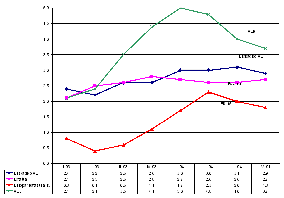 Lehen sektoreak izan du urte arteko hazkunderik onena 2004an, % 15,1ekoa, hain zuzen. Hartara, 2001. urteko mailara itzuli da, 2003an atzerakada nabarmenak izan ostean. Industriak era askoz profil biziagoa erakutsi du 2004an, aurreko urtean baino: % 2,4 urteko hazkundea izan du, urtebete lehenago izan zuen % 1,4ko tasa txikiagoaren aldean.