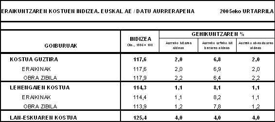 Urtarrilean prezio hazkunderik handienak kontsumitutako lehengaiek hauek izan zituzten: petroliotik eratorriak (%4,8), ateratze-agregatuak (%2,7), zementu artifiziala (%2,6), burdina eta altzairua (%2,3) eta lur erreak (%1,8) lehengaiek. Aitzitik, hileko prezioetan murrizketak izan zituzten bulego-materiala (%-1,1), metalezko hoditeria (%-1,0), beira (%-0,5), egiturak eta galdaragintza (%-0,4) eta karea, igeltsua eta eskaiola (%-0,1) lehengaiek.