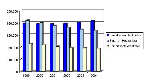 Unibertsitatearen aurretiko mailetan —Helduen Hezkuntza Iraunkorra alde batera utzita—, hizkuntza-ereduaren arabera, honela zeuden banatuta ikasleak 2003/04 ikasturtean: %28,5 A ereduan (euskara ikasgaitzat), %22,5 B ereduan (elebiduna) eta %48,3 D ereduan (euskaraz).