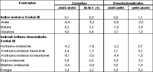 Sektoreen arabera, eta industri sektore nagusienak sailkatu ostean, 2005eko otsaileko indizearen bilakaera hazi egin da Energian (%3,4) eta Ekipamenduko ondasunetan (%0,9), 2004ko otsailarekin erkatuta. Kontsumo-ondasunek %4,2 egin dute behera. Azken hauetan bi atal bereiz daitezke: kontsumo-ondasun iraunkorrak, urte arteko %4,4ko hazkundea dutenak, eta kontsumo-ondasun ez iraunkorrak, %8,1eko atzerakada dutenak. Bestalde, Tarteko ondasunek urte arteko %-0,4ko tasa negatiboak dituzte.