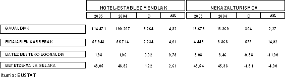 4.445 bidaiarik nekazalturismoak aukeratu dituzte, 2004ko aldi berean baino %14,9 gehiago. Guztira 13.673 gau igaro dituzte nekazalturismoetan, aurreko urtean baino %2,3 gehiago. Bidaiari bakoitzaren batez besteko egonaldia gutxitu delako eman da sarreren eta igarotako gauen erritmorik gabeko bilakaera hori; izan ere, aipatu batez besteko egonaldia aurreko urtearekin erkatuta 0,38 portzentaje-puntu gutxitu da. Plazen araberako okupazioa ere murriztu da (%4,0an) nekazalturismoen sektorean, plazen eskaintza handiagoa izan delako.