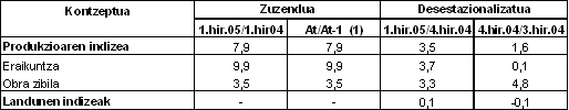 Eraikuntza-sektorearen bilakaera positiboa, 2005eko lehen hiruhilekoan, gehiago oinarritu zen eraikuntza azpisektorean, obra zibila azpisektorean baino. Izan ere, lehenak urte arteko % 9,9ko igoera izan zuen, eta bigarrenak, berriz, % 3,5ekoa, lan-egutegiaren eraginak zuzendu ostean.
