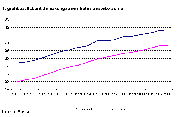 Ama izateko adinak gora egin duen neurrian, ezkontzeko adinak ere hala egin du. 2003an, ezkondu ziren gizonezko ezkongabeen batez besteko adina 31,7 urte zen, eta emakumezkoena, berriz, 29,7. 1986tik, senargaien batez besteko adina 4,3 urte igo da, eta emaztegaiena, 4,8.