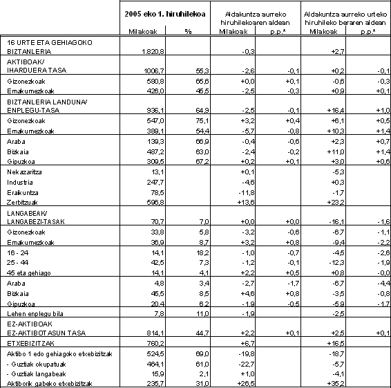Okupazio-tasa (hau da, 16 eta 64 urte arteko pertsona-kopuru osoaren aldean okupatuta dauden pertsonen portzentajea) %64,9 da, orain direla hiru hilabete baino dezima bat gutxiago. Tasa hau, gizonezkoetan, %75,1 da, eta emakumezkoentzat, berriz, %54,4 baino ez.