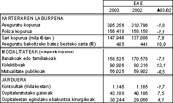 Banako edo familiako polizaren modalitatea, aseguratu gehien zituena izan bazen ere (%51,9), aseguratu gehien galdu zituena ere izan zen (%-7,1); horien atzetik mutualitate publikoetako polizek ere aseguratu asko galdu zuten (%-6,5). Aitzitik, aseguru kolektiboek (enpresa edo beste talde zehatz batzuei zuzendutakoek), aseguratutako biztanleen %29,7arekin, %13,1eko hazkundea izan zuten; horrela, 1999. urtean hasitako gehitzeko bilakaerarekin jarraitu zuten.