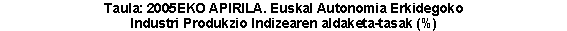Sektoreen arabera, eta industri sektore nagusienak sailkatu ostean, 2005eko apirileko indizearen bilakaera hazi egin da sektore guztietan, 2004ko otsailarekin erkatuta. Kontsumo-ondasunak %6,8 hazi ziren, kontsumo-ondasun iraunkorrak eta kontsumo-ondasun ez iraunkorrak ere hazi egin zirelako (%7,3 eta %6,6, hurrenez hurren). Ekipamenduko ondasunak %5,6ko urte arteko tasarekin hazi ziren, Tarteko ondasunak %2,9rekin eta Energia %3,6rekin.