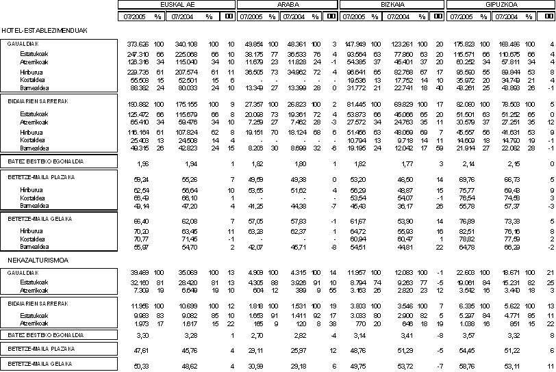 2005eko uztailean, 190.882 bidaiari-sarrera erregistratu ziren Euskal AEko hotel-establezimenduetan, aurreko urteko hil berean baino 15.000 sarrera pasa gehiago, hau da, %9 gehiago, Eustatek eskainitako datuen arabera. Bidaiari-sarrerek bilakaera positiboa izan zuten hiru lurraldeetan: Bizkaian %17ko gehikuntza handia izan zen, Gipuzkoan %5ekoa eta Araban neurritsuagoa, %2koa; guztiak aurreko urteko hil berarekin alderatuta.